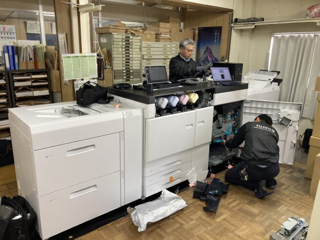**新型オンデマンド印刷機「Revoria Press EC2100S」**が導入されました。メーカー様、重量屋様のご協力により、無事に搬入作業が完了いたしました。本機は特色インキに対応しており、これまで以上に鮮やかな色表現やメタリックカラーなど、印刷表現の幅が大きく広がります。今後は弊社の新たな戦力として、より魅力的な印刷物づくりに活躍してもらう予定です。